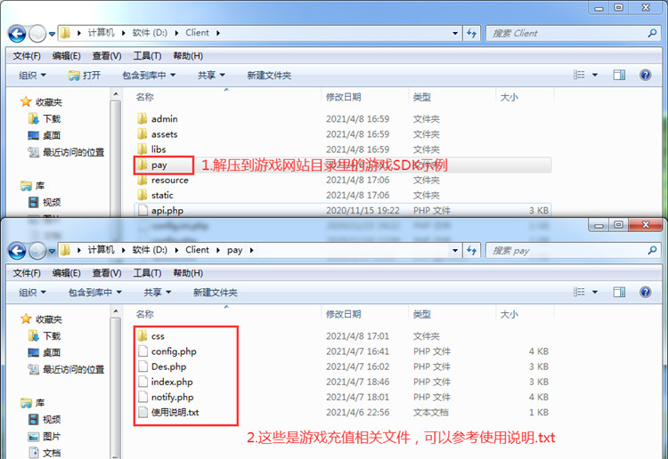 第二步,将下载的接口示例文件解压,放到游戏网站目录下