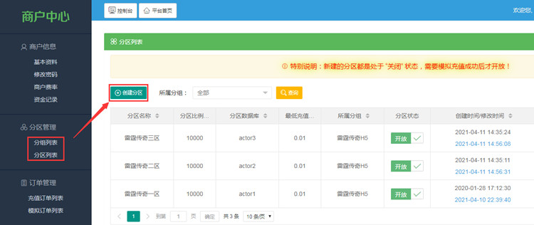 第四步,分区添加好后,先进行模拟充值,看分区配置是否正确,然后启动网关