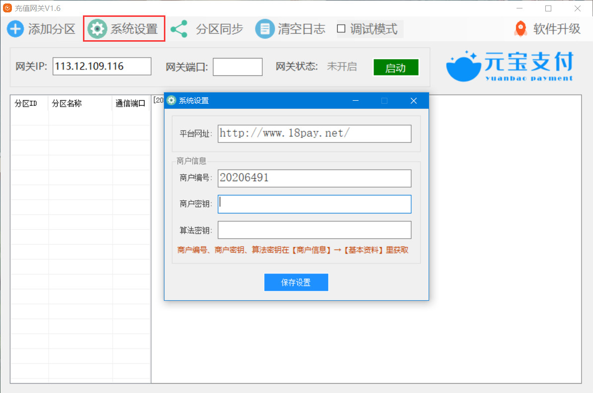 第二步,打开充值网关软件,切换到【系统设置】菜单,填写商户信息