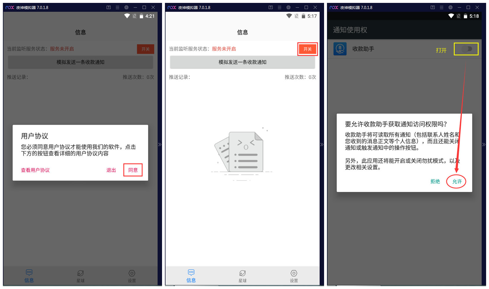 1、首次安装的用户,同意用户协议后,点击“开关”按钮,允许收款助手获取通知访问权限。