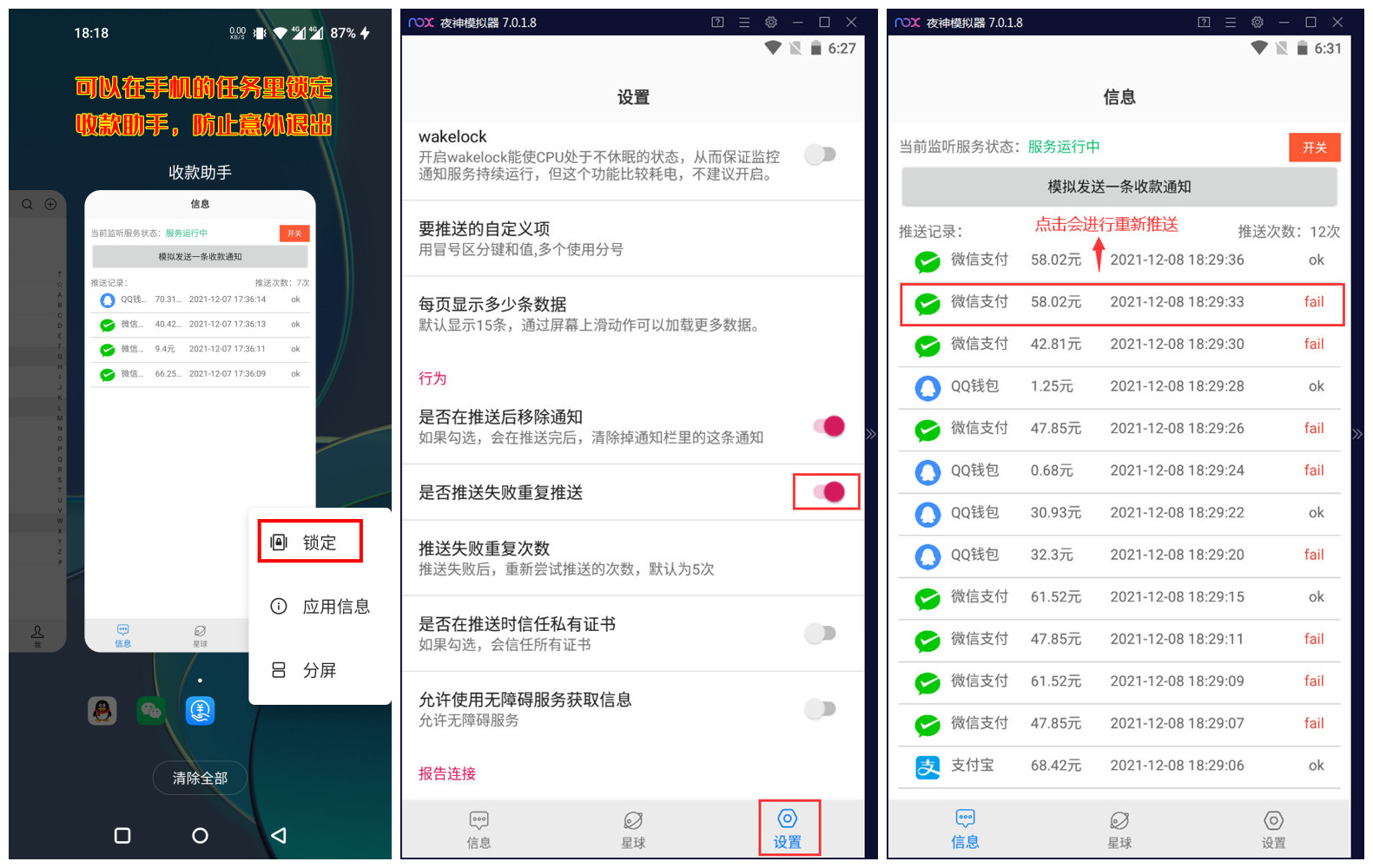 (1)、请保持收款助手一直运行于后台,不得关闭退出,建议在手机任务里锁定程序;