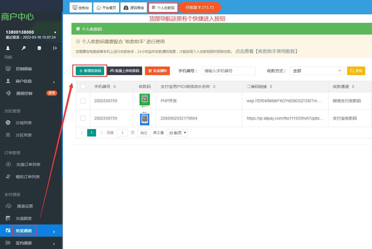 1、登录元宝支付平台,在 “支付通道” → “免签约通道” → “收款码” 里上传收款码