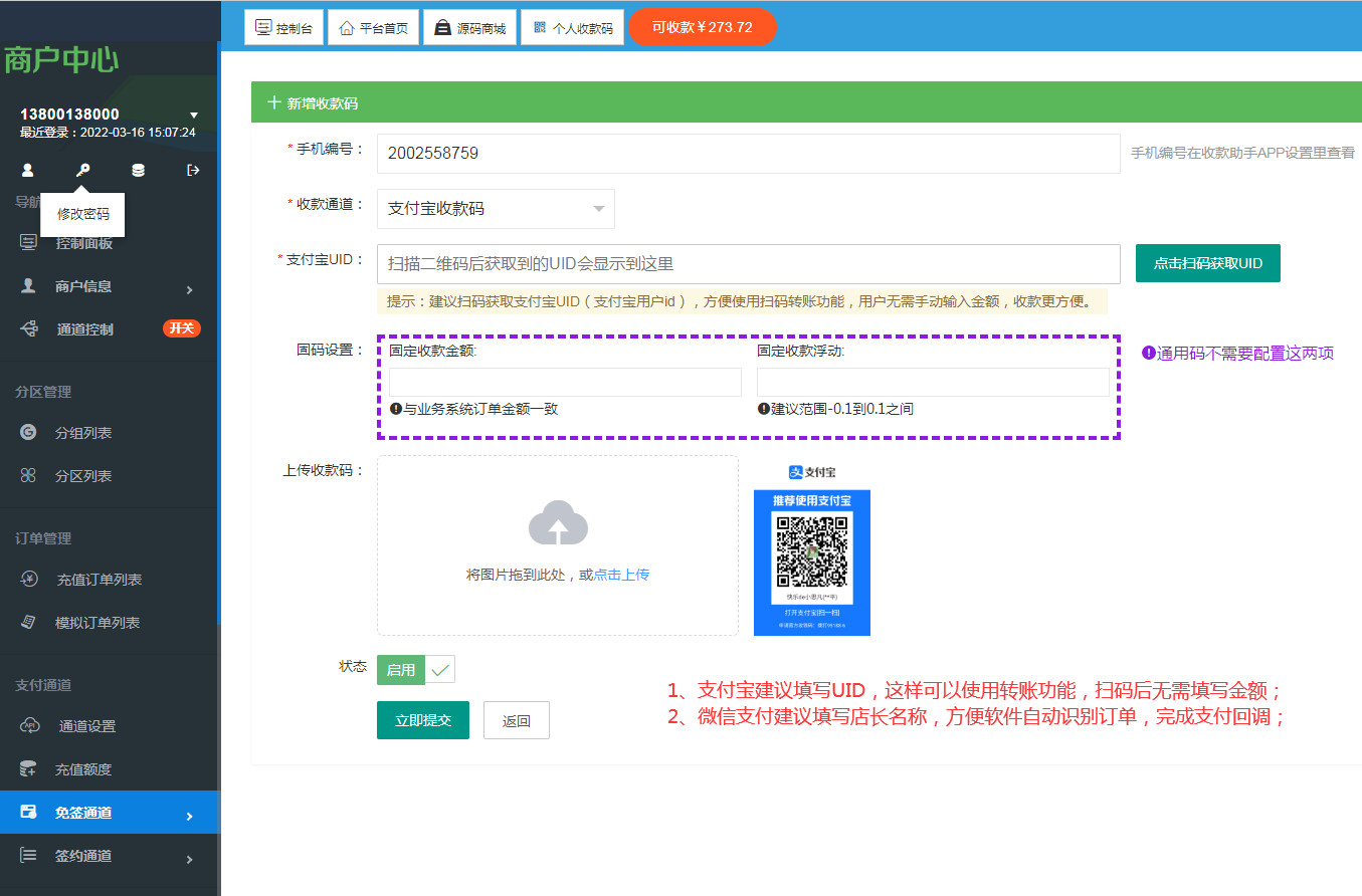 2、按照要求上传收款码,支付宝建议填写UID,微信支付建议填写店长名称