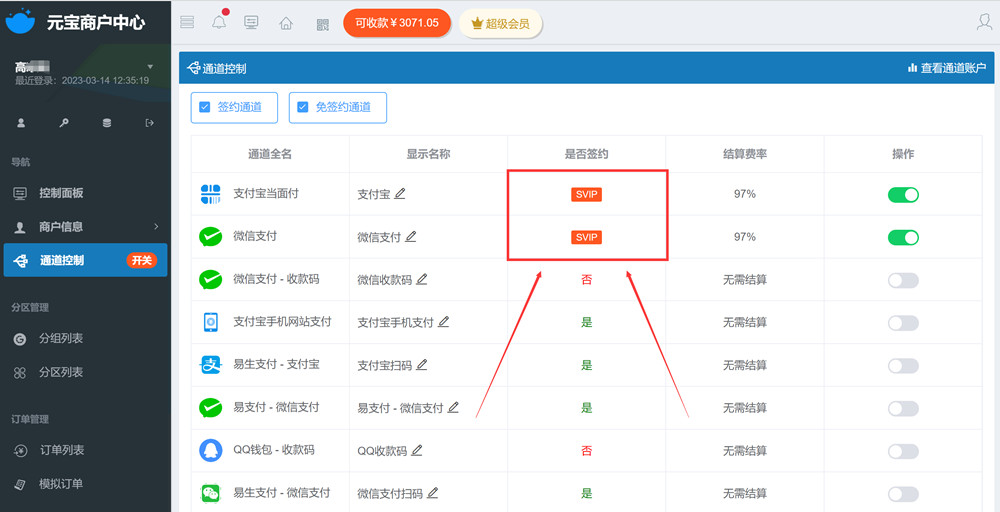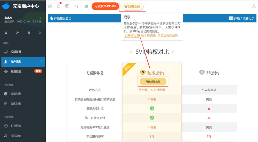 申请系统收款通道 开通超级会员步骤 如何申请系统收款通道? 需要开通超级会员(SVIP)才可以使用平台系统的第三方支付通道,收款稳定不掉单,无需软件挂机,满100元第二天中午自动提现到账。 费率3% D1结算 开通超级会员(SVIP)步骤 1、“商户中心” → 顶部菜单点击“超级会员”按钮,接着点击开通超级会员; 2、付费开通会员,即可直接使用平台第三方支付通道,在“商户中心” → “通道控制”里会看到有SVIP标志的通道,如下图: